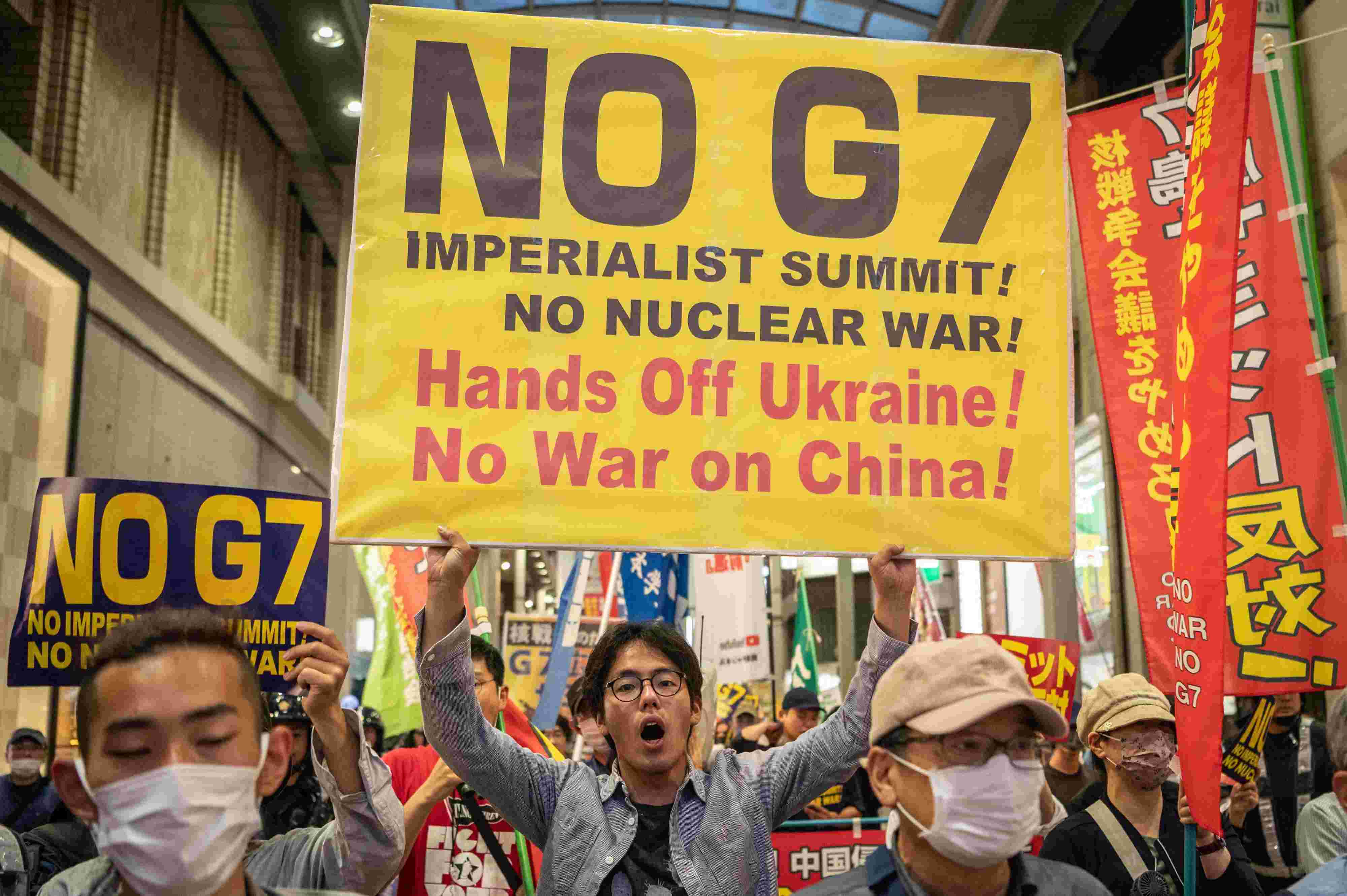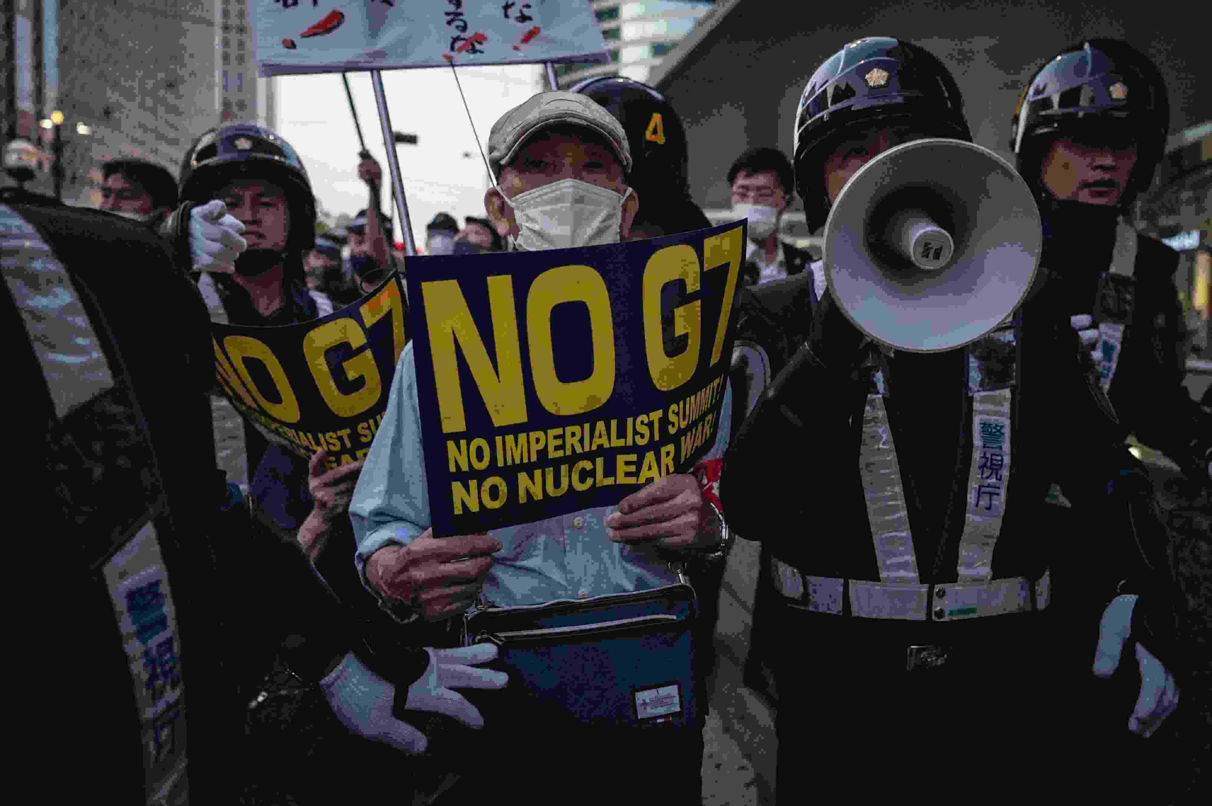 當?shù)貢r間2023年5月17日,日本廣島,日本民眾舉著各式標語,在廣島和平紀念公園原子彈轟炸遺址舉行集會,強烈抗議七國集團(G7)峰會將在廣島召開。 視覺中國