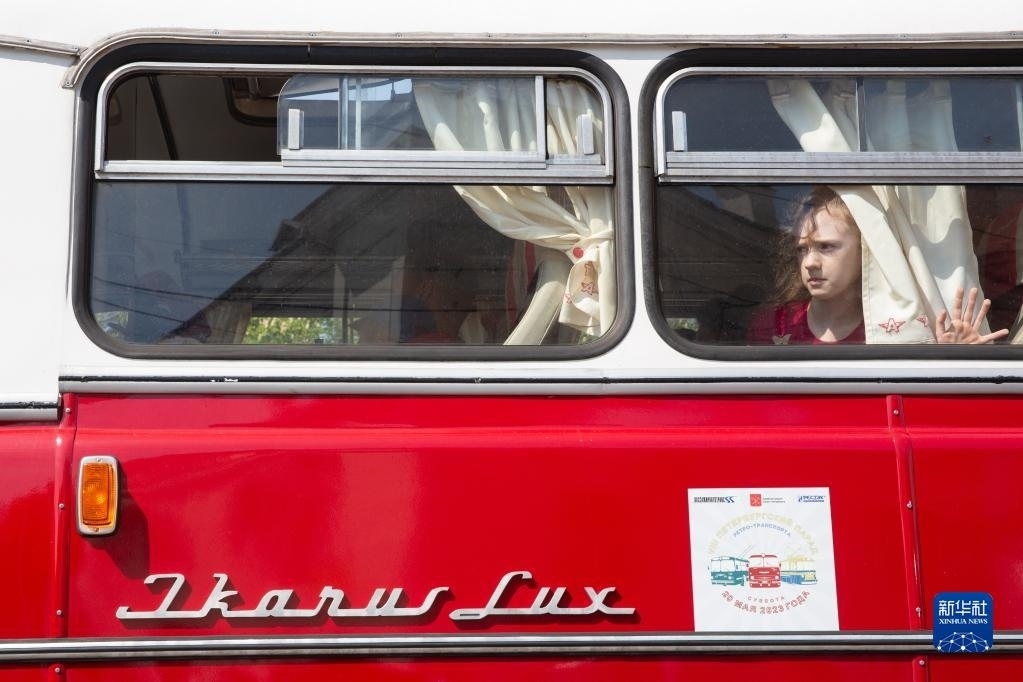 5月20日,小朋友在俄羅斯圣彼得堡參觀街頭老爺車(chē)展。