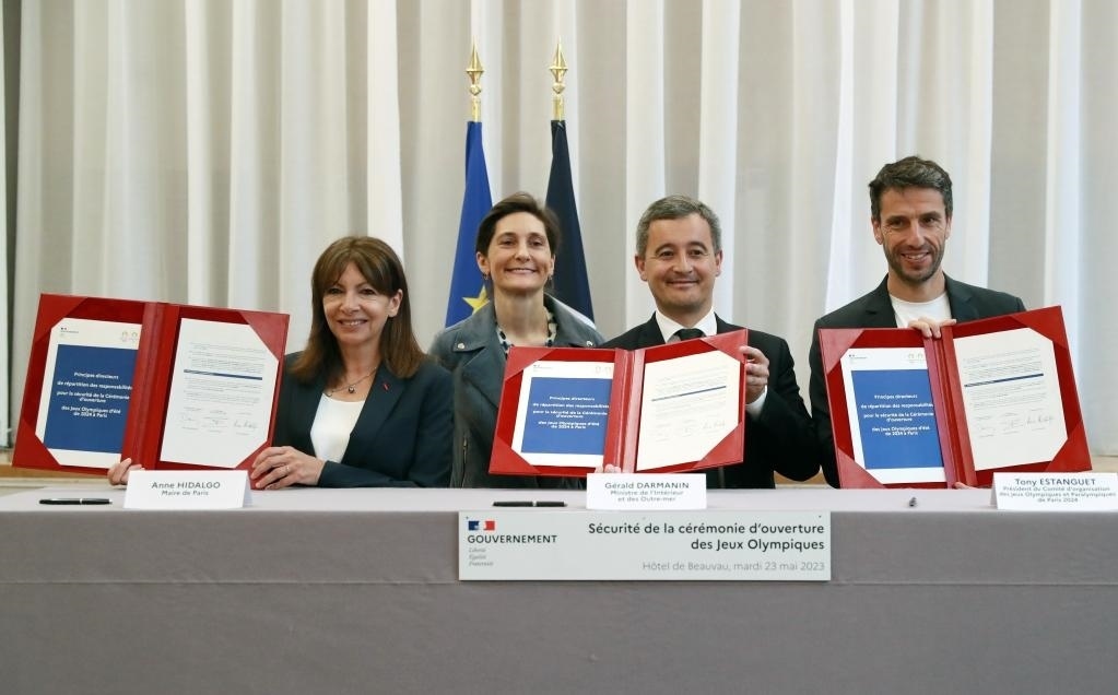 5月23日,為確保巴黎奧運會“河上”開幕式安全順利舉行,法國內(nèi)政部、巴黎奧組委、巴黎市政府三方在巴黎簽訂協(xié)議,明確各自的安保職責(zé)。新華社記者 高靜 攝