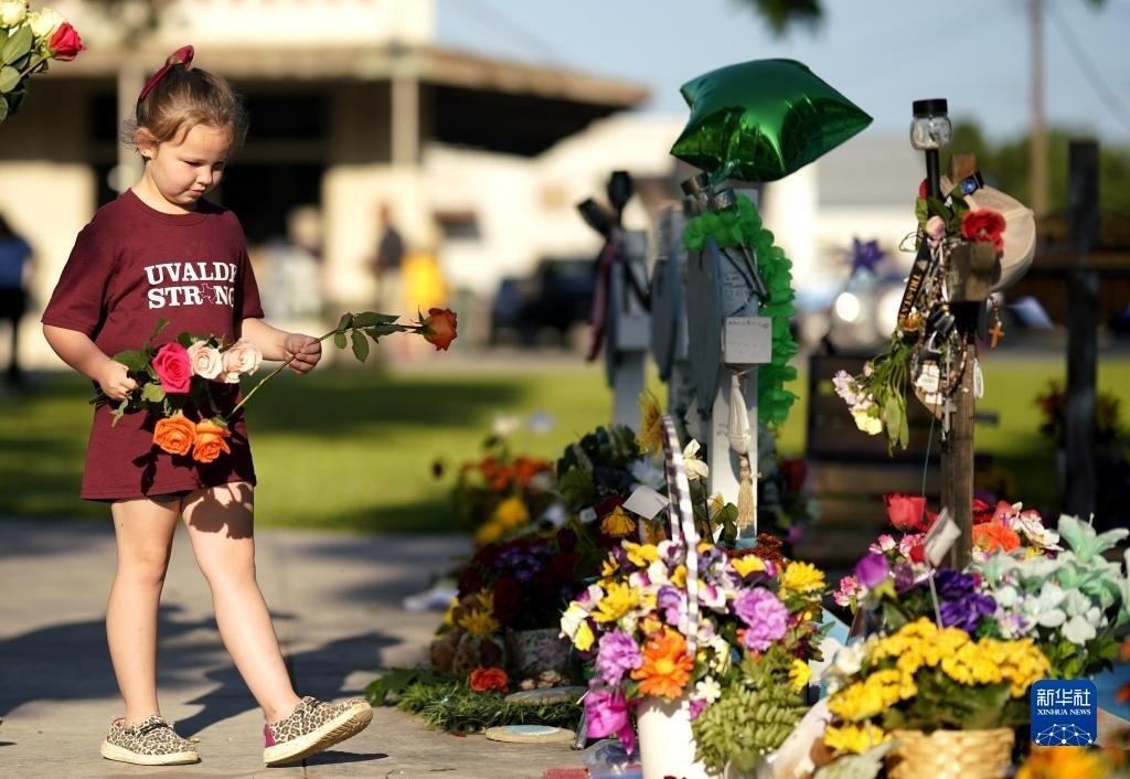 5月24日,在美國得克薩斯州小城尤瓦爾迪的廣場上,一名女孩獻上鮮花悼念校園槍擊遇害者。
