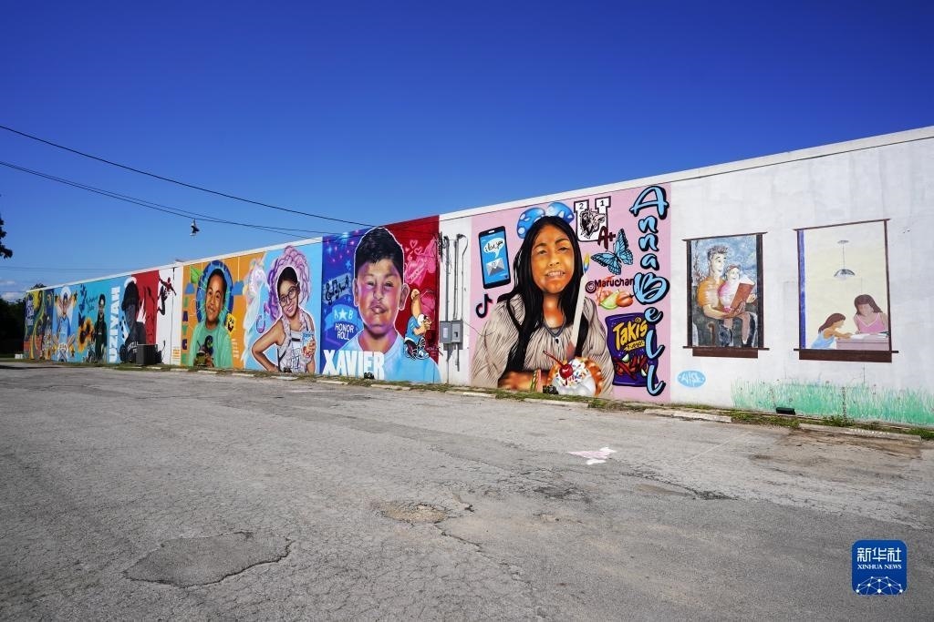 這是5月24日在美國得克薩斯州小城尤瓦爾迪拍攝的緬懷槍擊事件遇害者的墻繪。