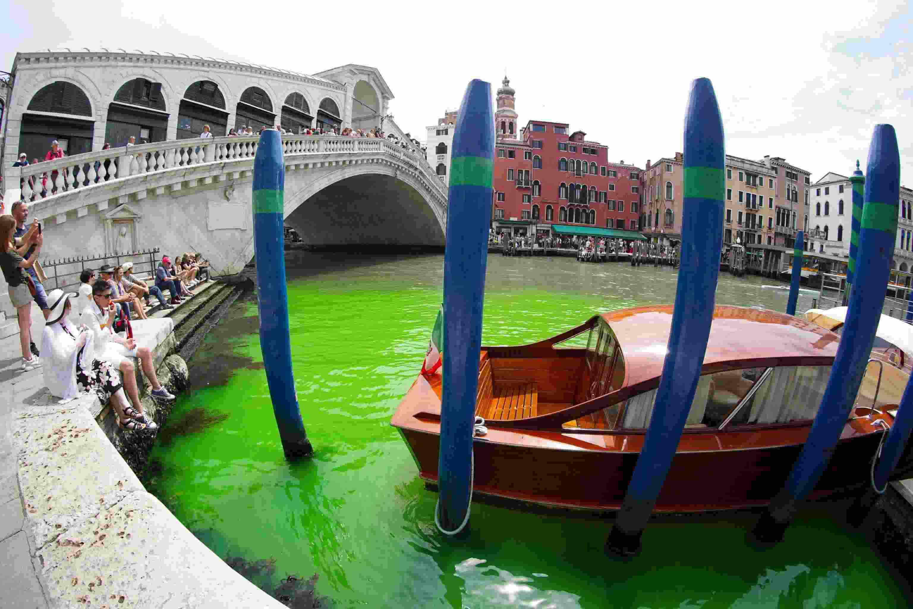 當?shù)貢r間2023年5月28日,意大利威尼斯大運河里亞托橋附近水域變成了熒光綠的顏色,警方等部門已經介入調查,尋找原因。 視覺中國