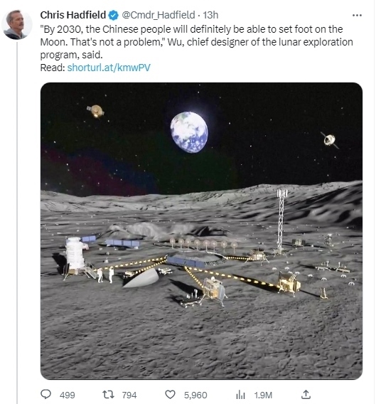 據報道,加拿大航天局前宇航員克里斯·哈德菲爾德在社交媒體推特上轉發(fā)了CGTN的一篇報道,他同時寫道,“中國探月工程總設計師吳偉仁說,‘到2030年,中國人的足跡一定能夠踏上月球。這不是個問題?!?/p>