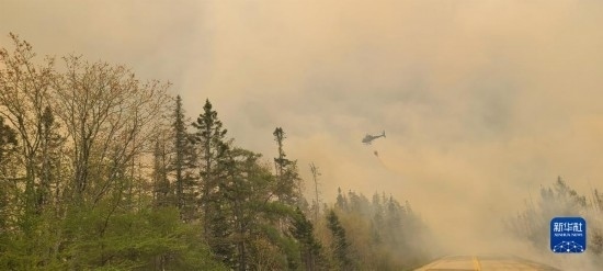5月31日,在加拿大新斯科舍省謝爾本縣巴靈頓湖附近,一架飛機(jī)飛過野火上空。新華社發(fā)(新斯科舍省政府供圖)