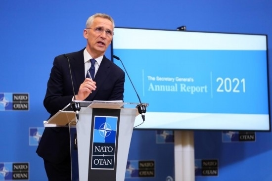 2022年3月31日,在比利時布魯塞爾,北約秘書長斯托爾滕貝格在新聞發(fā)布會上講話。新華社記者鄭煥松攝