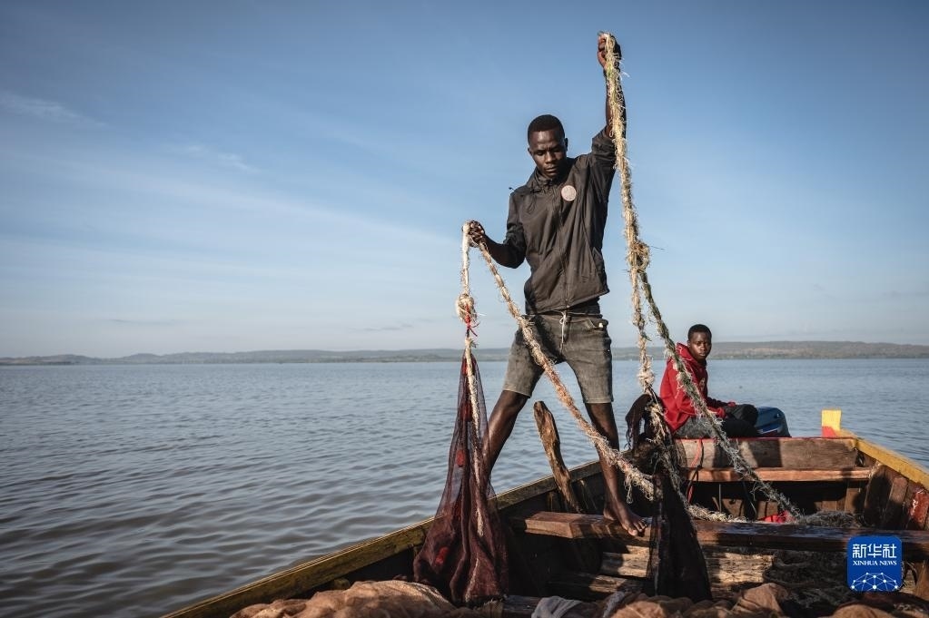 6月10日,坦桑尼亞姆萬(wàn)扎省維多利亞湖畔的漁民整理漁網(wǎng)。