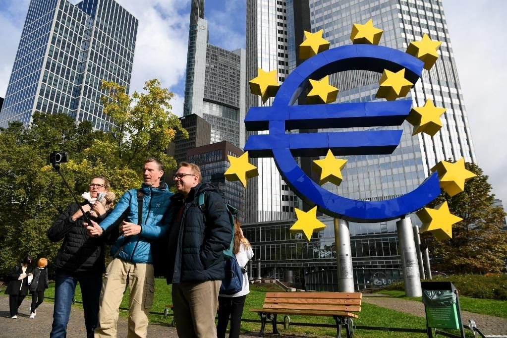 2021年10月13日,人們?cè)诘聡?guó)法蘭克福歐元雕塑前自拍留影。新華社記者 逯陽(yáng) 攝