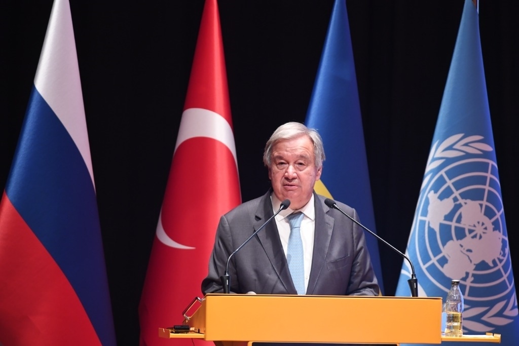 2022年8月20日,在位于土耳其伊斯坦布爾的土耳其國防大學(xué)內(nèi)的黑海糧食外運(yùn)聯(lián)合協(xié)調(diào)中心,聯(lián)合國秘書長古特雷斯出席新聞發(fā)布會(huì)。新華社記者沙達(dá)提攝