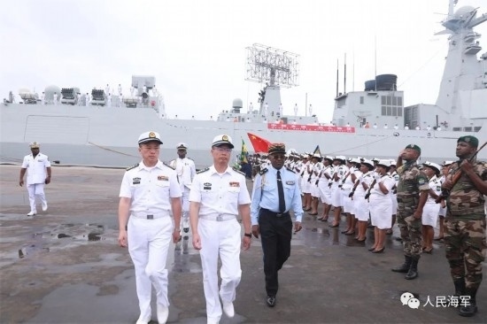 當(dāng)日上午9時(shí),懸掛著中加兩國(guó)國(guó)旗的編隊(duì)艦艇緩緩靠泊奧文多港碼頭,中國(guó)駐加蓬大使李津津及使館工作人員、當(dāng)?shù)刂匈Y機(jī)構(gòu)人員、華人華僑代表,加蓬國(guó)防部秘書(shū)長(zhǎng)彭吉中將及官兵代表等300余人位碼頭迎接。