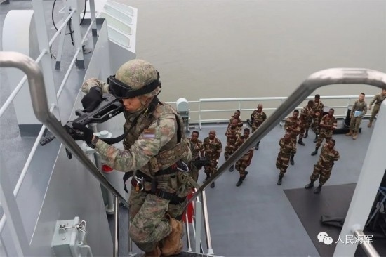 微山湖艦上,編隊(duì)特戰(zhàn)隊(duì)員向加方海軍陸戰(zhàn)隊(duì)員介紹了我特戰(zhàn)武器裝備,演示教授了滑降和艙室搜索等科目,并與加方海軍陸戰(zhàn)隊(duì)員進(jìn)行了反恐反海盜、武力營(yíng)救等專(zhuān)業(yè)交流。