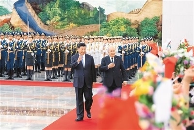 | 七月十八日下午,國(guó)家主席習(xí)近平在北京人民大會(huì)堂同來華進(jìn)行國(guó)事訪問的阿爾及利亞總統(tǒng)特本舉行會(huì)談。這是會(huì)談前,習(xí)近平在人民大會(huì)堂北大廳為特本舉行歡迎儀式。新華社記者 翟健嵐攝 |