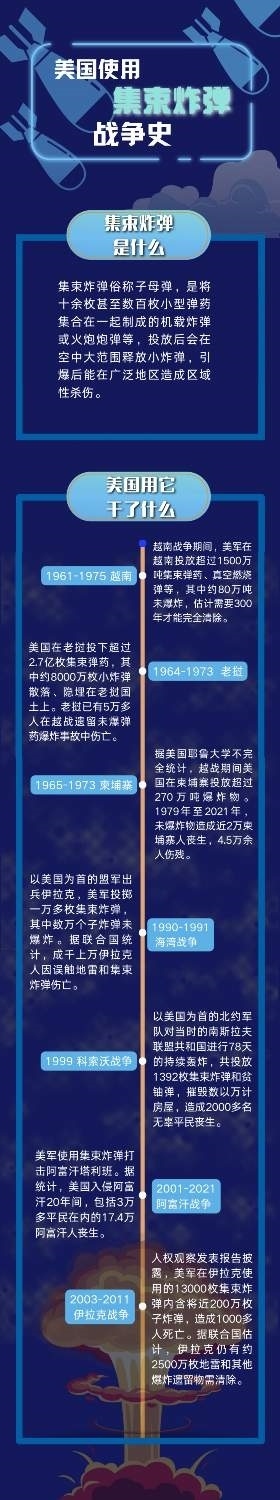 集束彈藥比普通彈藥殺傷力更強、造成平民傷亡可能性更大。美國空軍曾經(jīng)在越南戰(zhàn)爭、海灣戰(zhàn)爭、伊拉克戰(zhàn)爭等戰(zhàn)事中大量使用集束炸彈,給這些國家民眾及子孫后代帶來無法磨滅的傷痛。