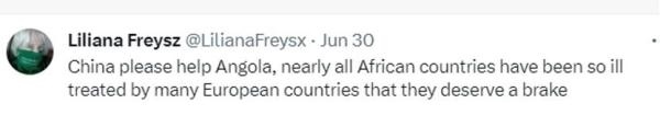網(wǎng)友利利安娜·弗賴斯直呼:“中國請幫助安哥拉,幾乎所有非洲國家都忍受過歐洲國家的糟糕對待,它們該迎來轉(zhuǎn)機(jī)了。”