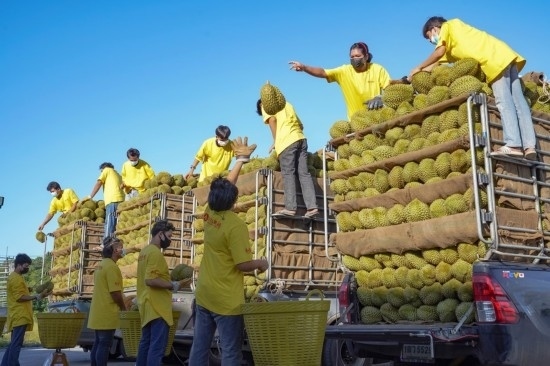 2021年5月30日,在重慶洪九果品股份有限公司位于泰國尖竹汶府的工廠內(nèi),工作人員在裝運(yùn)即將銷往中國的榴蓮。新華社發(fā)