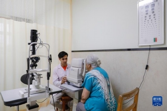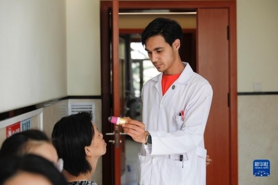 甘肅中醫(yī)藥大學(xué)針灸推拿專業(yè)的土庫曼斯坦留學(xué)生迪達(dá)(左)在臨床實(shí)習(xí)中為患者檢查眼睛(7月28日攝)。新華社記者 方欣 攝
