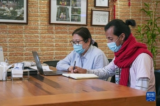 7月20日,在匈牙利布達(dá)佩斯匈牙利岐黃中醫(yī)藥中心,中心負(fù)責(zé)人陳震(右)和甘肅外派專家張海芳一同討論。新華社發(fā)(弗爾季·奧蒂洛攝)