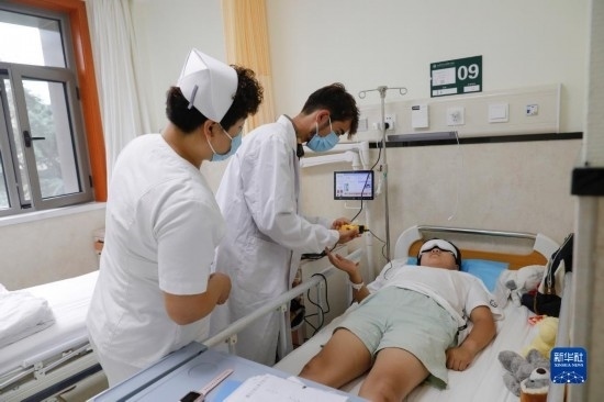 甘肅中醫(yī)藥大學(xué)針灸推拿專業(yè)的塔吉克斯坦留學(xué)生紀(jì)明哲(中)在臨床實(shí)習(xí)中為患者進(jìn)行直流電離子導(dǎo)入操作(7月27日攝)。新華社記者 方欣 攝