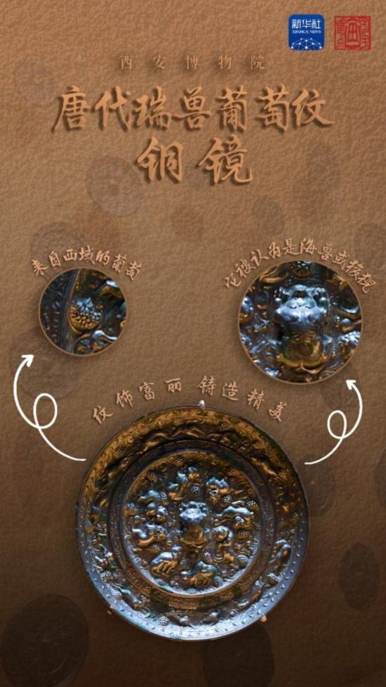 在唐代,我國(guó)銅鏡制作和使用進(jìn)入繁盛時(shí)期,許多通過絲綢之路傳來的紋樣被工匠應(yīng)用在銅鏡上。瑞獸葡萄紋銅鏡紋飾富麗、鑄造精美,備受當(dāng)時(shí)民眾的青睞。瑞獸葡萄紋銅鏡將裝飾藝術(shù)和現(xiàn)實(shí)生活緊密結(jié)合,瑞獸象征著敏捷與美好,葡萄則象征著豐收充裕和多子多福,呈現(xiàn)出濃郁的盛唐氣象,是我國(guó)古代中西方文化交流的代表性產(chǎn)物。