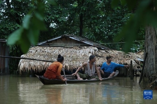 8月12日,在緬甸勃固鎮(zhèn)洪災(zāi)區(qū),人們乘船出行。新華社發(fā)(苗覺梭攝)