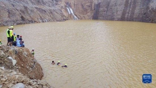 從事故現(xiàn)場發(fā)回的照片和視頻看,救援和遺體搜尋工作主要在坍塌礦區(qū)的堰塞湖進(jìn)行。