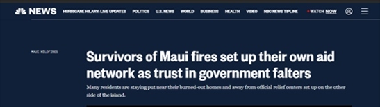 美國全國廣播公司8月16日?qǐng)?bào)道,由于不信任政府,一些毛伊島居民仍然在自家受損的房屋附近尋求庇護(hù),拒絕到位于島的另一側(cè)的政府救助中心。