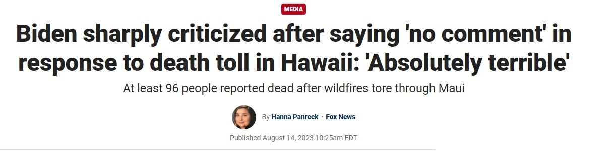 ??怂剐侣劸W(wǎng)8月14日?qǐng)?bào)道稱,當(dāng)?shù)貢r(shí)間13日上午,毛伊島救災(zāi)仍在進(jìn)行,美國總統(tǒng)拜登卻在其位于特拉華州里霍伯斯海灘的海邊別墅過周末。當(dāng)被問及毛伊島大火造成的死亡人數(shù)正不斷上升的問題時(shí),拜登表示“不予置評(píng)”。