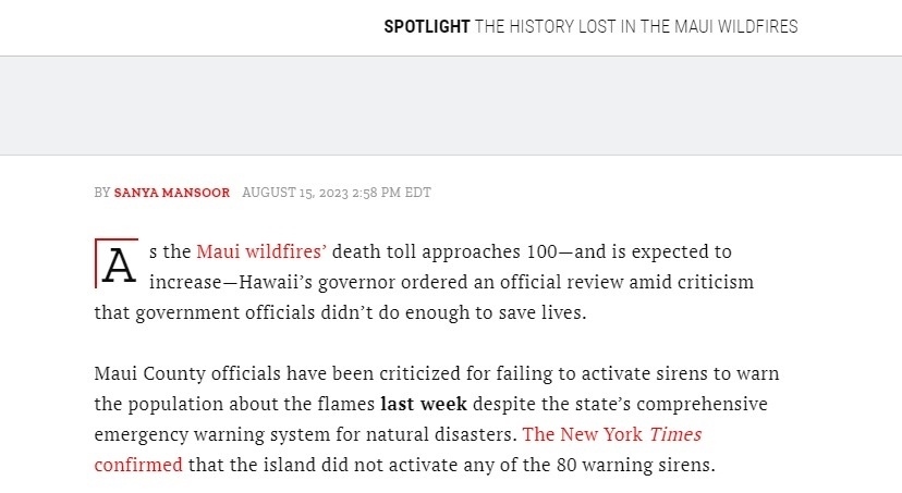 據(jù)悉,夏威夷毛伊島部署有80個(gè)警報(bào)器,但是在此次野火來襲過程中,警報(bào)器并未響起。安達(dá)亞16日曾表示,他并不后悔沒有拉響警報(bào)器,因?yàn)榫瘓?bào)器通常是用來警示海嘯的,反而可能導(dǎo)致很多民眾逃向內(nèi)陸地勢(shì)較高處,從而進(jìn)入火海。這一表態(tài)激起了廣泛爭議和批評(píng)。
