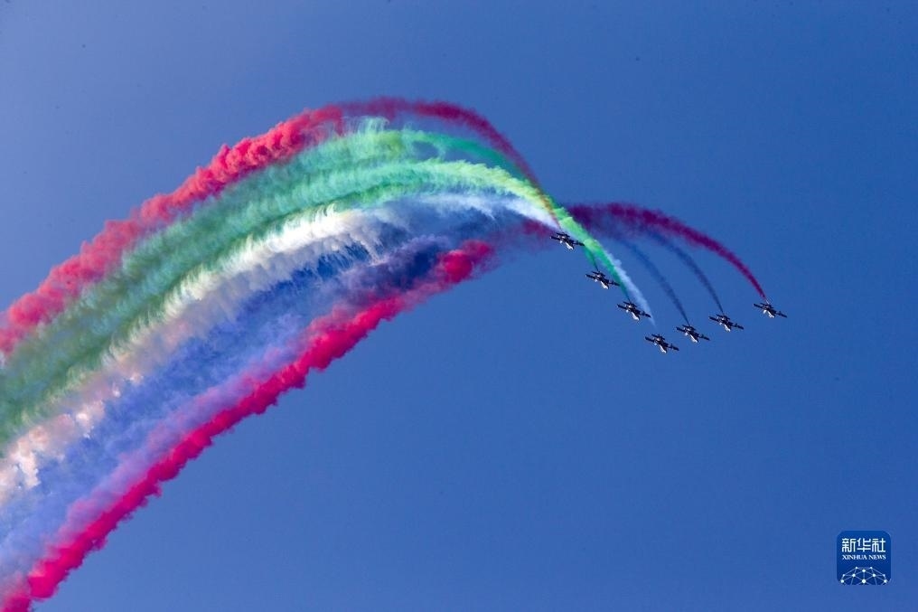 9月2日,在希臘塔納格拉空軍基地的雅典飛行周上,來自意大利的飛行表演隊(duì)進(jìn)行表演。新華社發(fā)(馬里奧斯·羅洛斯攝)