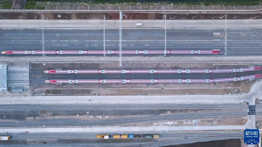 7月20日,雅萬高鐵列車??吭谟《饶嵛鱽喨f隆德卡魯爾動(dòng)車所附近(無人機(jī)照片)。新華社記者 徐欽 攝