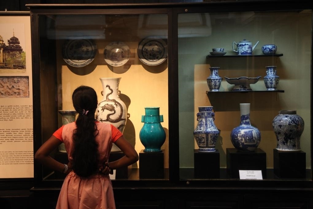 2014年9月15日,在斯里蘭卡首都科倫坡,游客參觀斯里蘭卡國家博物館展出的當地出土的中國古代瓷器,一些中國外銷瓷器上還繪有南亞、伊斯蘭風情,與鄭和碑共同見證著古代海上絲綢之路和中斯友好交往的源遠流長。 新華社記者馮武勇攝