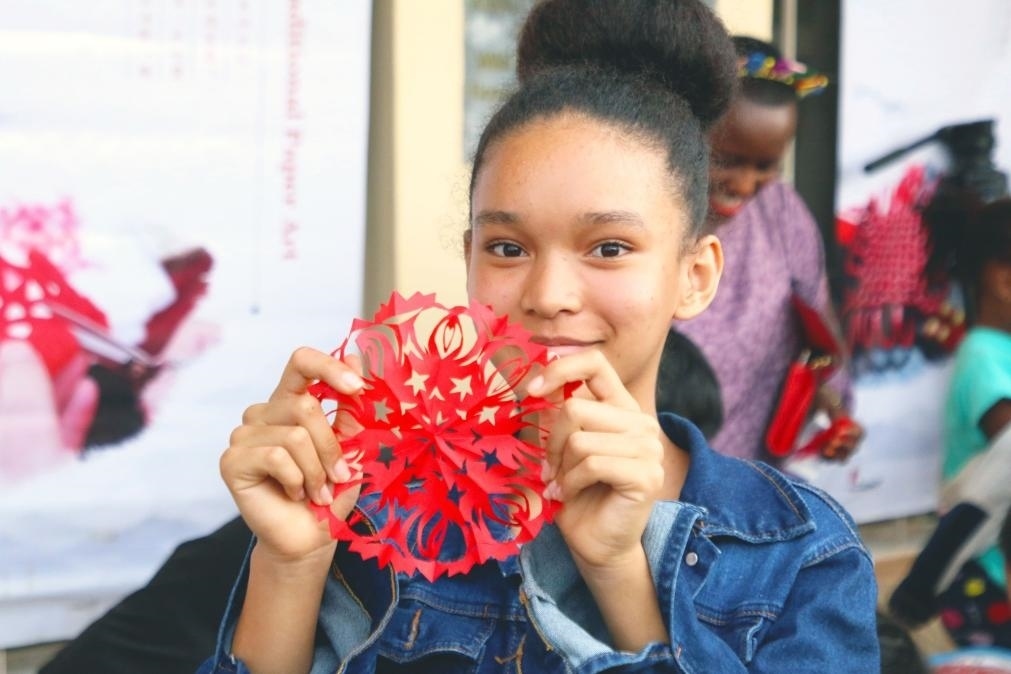 9月23日,盧旺達(dá)首都基加利,在盧旺達(dá)大學(xué)孔子學(xué)院舉辦的“中國文化進(jìn)校園”暨中秋國慶慶?;顒?dòng)現(xiàn)場,一名女孩展示剪紙成果。(新華社發(fā),黃萬晴攝)