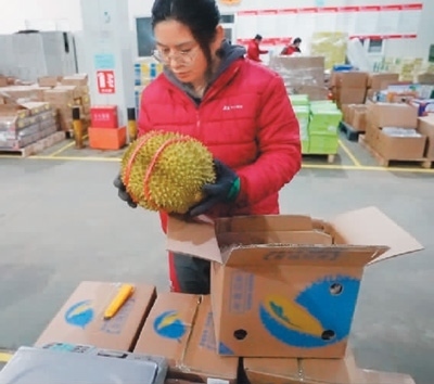 兩個(gè)多小時(shí)后,在北京市海淀區(qū)的一個(gè)快遞站點(diǎn),京東快遞員侯建東從傳送帶上拿到了一箱榴蓮。