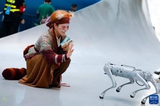 10月18日,在第81屆世界科幻大會(huì)主場(chǎng)館——成都科幻館內(nèi),一名演員與機(jī)器狗互動(dòng)。