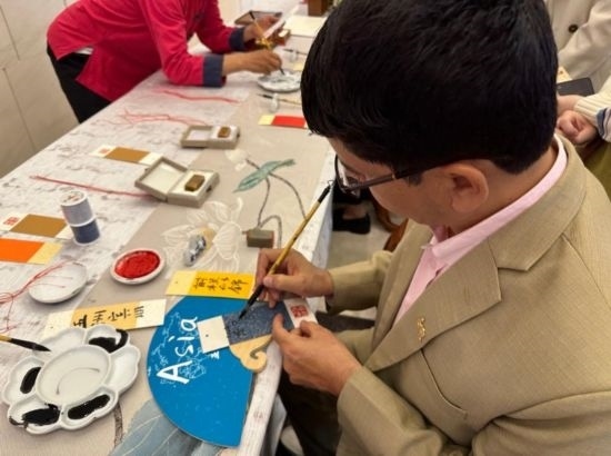 嘉賓體驗(yàn)中國(guó)書(shū)法書(shū)寫過(guò)程 (新華社記者王艷剛攝)