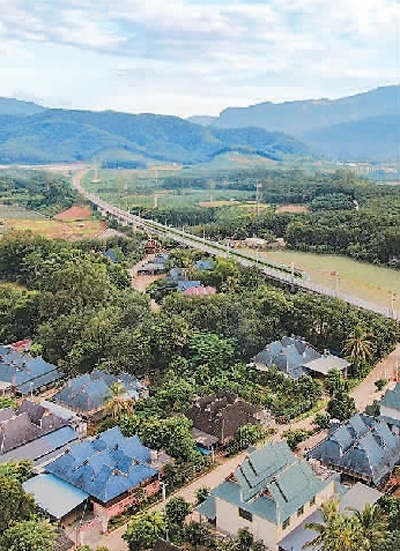 云南省景洪市勐罕鎮(zhèn),中老鐵路上的動(dòng)車從傣族村寨旁駛過。新華社發(fā)