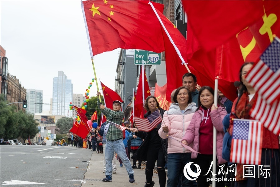 習近平乘坐的車隊離開機場前往下榻飯店途中,許多華僑華人和中國留學生代表等候在沿途街道,揮舞中美兩國國旗,熱烈歡迎習近平主席到訪。