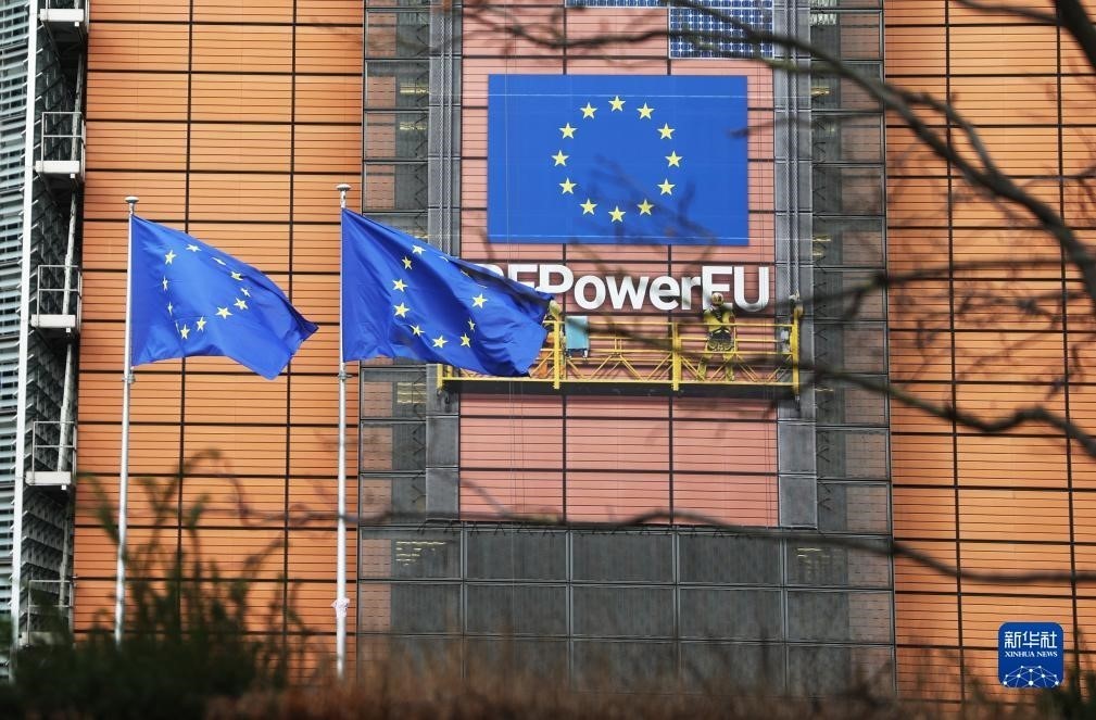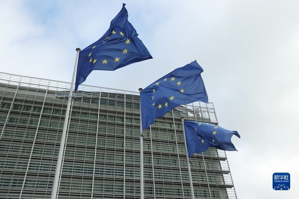 11月15日,歐盟旗幟在比利時布魯塞爾的歐盟委員會總部大廈外飄揚。新華社記者 趙丁喆 攝