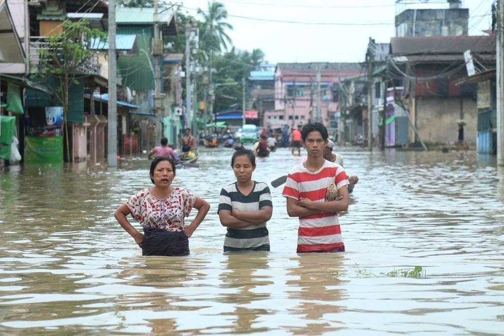2023年8月12日,人們?cè)诰挼椴替?zhèn)被水淹沒(méi)的道路上涉水前行。新華社發(fā)(苗覺(jué)梭攝)