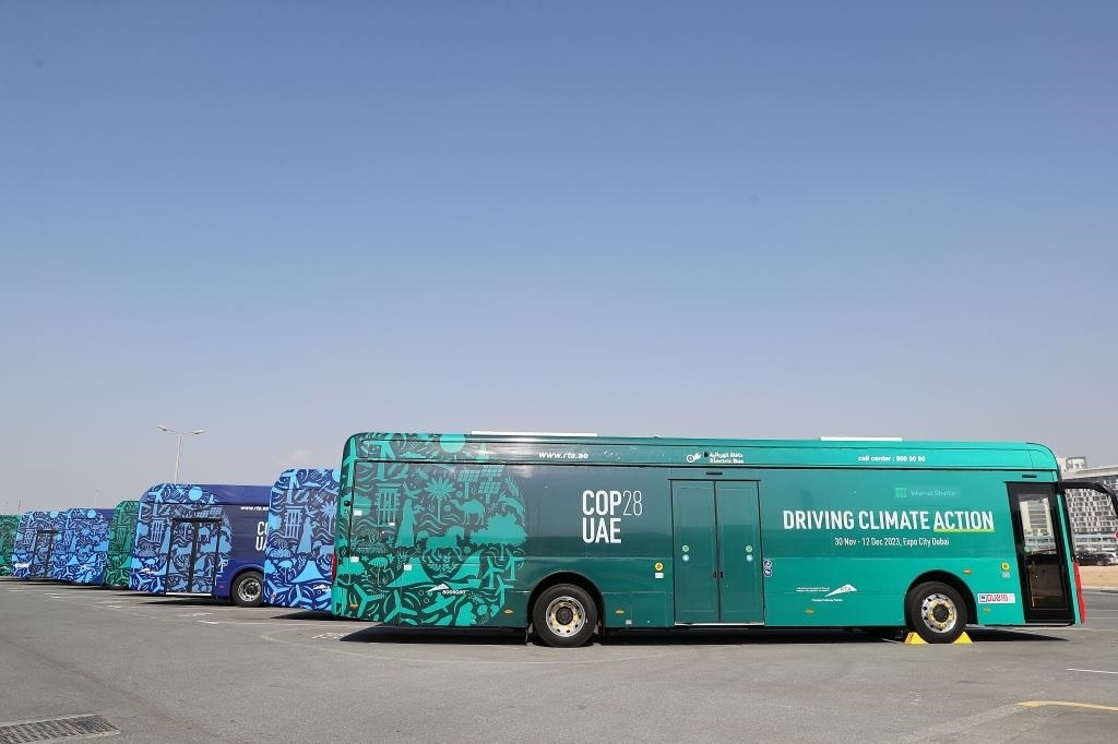 2023年12月3日,中國(guó)蘇州金龍公司的海格電動(dòng)巴士(前)??吭诼?lián)合國(guó)氣候變化迪拜大會(huì)的擺渡車停車場(chǎng)。新華社記者 王東震 攝