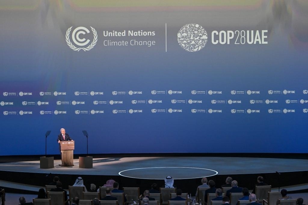 2023年12月1日,聯(lián)合國(guó)秘書長(zhǎng)古特雷斯在阿聯(lián)酋迪拜世界氣候行動(dòng)峰會(huì)開(kāi)幕現(xiàn)場(chǎng)致辭。新華社發(fā)(聯(lián)合國(guó)氣候變化迪拜大會(huì)供圖)