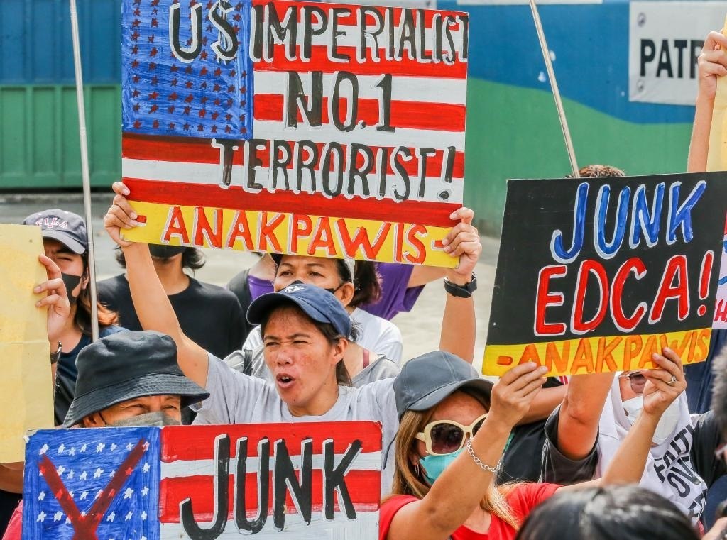 2023年4月11日,在菲律賓首都大馬尼拉地區(qū)奎松城,民眾參加集會活動,抗議菲律賓和美國軍方舉行聯(lián)合軍事演習。菲律賓和美國軍方當天在菲首都馬尼拉啟動為期18天的2023年度“肩并肩”聯(lián)合軍事演習。新華社發(fā)(烏馬利攝)