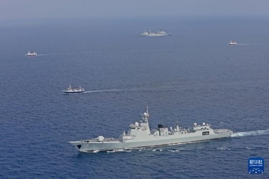 中國(guó)海軍第45批護(hù)航編隊(duì)烏魯木齊艦、東平湖艦為中國(guó)漁船護(hù)航(2023年10月20日攝)。新華社發(fā)(王遠(yuǎn)方攝)