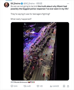 報(bào)道還提到,X平臺(tái)上另一篇帖子內(nèi)容稱,邁阿密警方此次出警執(zhí)法可能是“我一生中見(jiàn)過(guò)規(guī)模最大”的警方行動(dòng),然而官方?jīng)]有告知公眾真相,“他們說(shuō)那是青少年打斗,到底發(fā)生了什么?”這則帖子內(nèi)容目前已獲5900萬(wàn)閱讀量?!?/p>