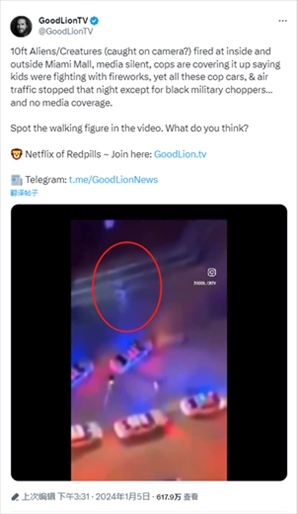 報(bào)道提到,一個(gè)推廣涵蓋科幻、陰謀論等內(nèi)容電影和紀(jì)錄片的X平臺(tái)賬號(hào)曬出現(xiàn)場(chǎng)視頻稱,“10英尺高的外星人/生物(被攝像機(jī)拍到?)朝邁阿密購(gòu)物中心內(nèi)外開(kāi)火,媒體沉默,警察掩蓋說(shuō)孩子們?nèi)挤艧熁ú⒋蚨?,然而除了黑色軍用直升機(jī),所有警車和空中交通都在那天晚上一動(dòng)不動(dòng)……這卻沒(méi)有媒體報(bào)道。視頻中出現(xiàn)了行走的身影。你覺(jué)得呢?”↓