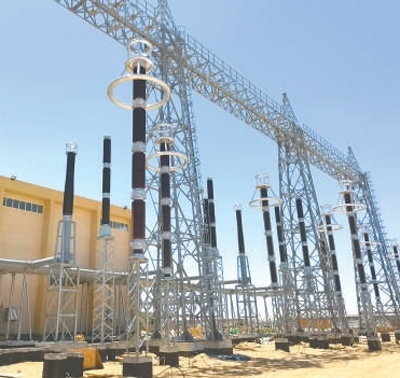 位于蘇伊士省的??怂_迪亞500千伏變電站項(xiàng)目現(xiàn)場,鐵塔高聳,一條條高壓輸電導(dǎo)線接入變電站設(shè)備,電流通過導(dǎo)線時(shí)發(fā)出嗡嗡聲。