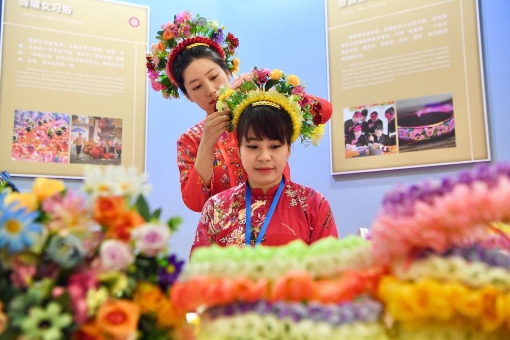 2月2日,兩名女孩在2024中國-東盟人文交流年展覽活動上展示福建蟳埔女頭飾。新華社記者 姜克紅 攝