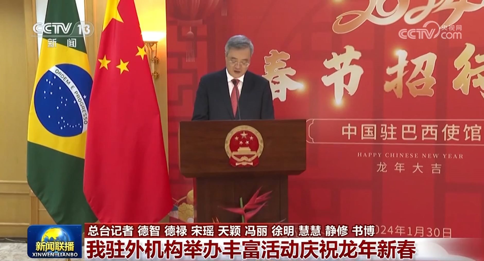 央視網(wǎng)消息(新聞聯(lián)播):連日來,我駐國際組織代表團(tuán)和駐多國使館舉辦春節(jié)招待會(huì)等活動(dòng),共慶龍年新春。