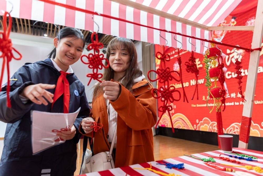 1月28日,復(fù)旦大學(xué)第二附屬學(xué)校學(xué)生(左)為馬斯卡廷學(xué)生(右)介紹中國結(jié)。