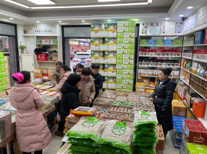 這是湖南長(zhǎng)沙高橋大市場(chǎng)堅(jiān)果經(jīng)銷商李海麗(右一)在向顧客介紹非洲堅(jiān)果。新華社記者 余春生 攝