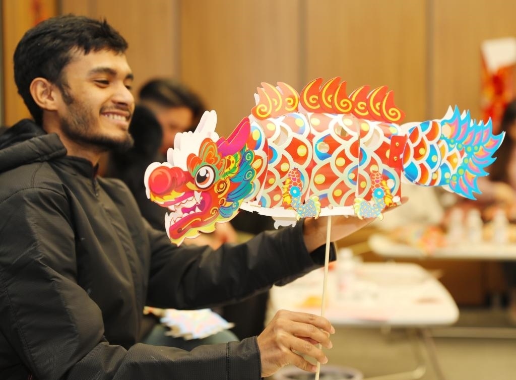 ?2月23日,在山東自貿(mào)試驗區(qū)青島片區(qū),外國留學(xué)生拼裝龍形花燈。新華社發(fā)(張進(jìn)剛攝)